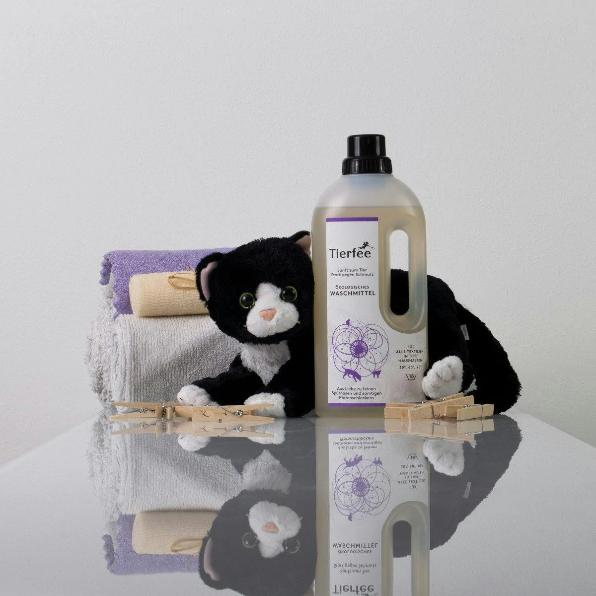 Tierfee ökologisches Waschmittel (30, 60, 90 Grad) eignet sich für alle Textilien im Haushalt mit Tieren. Tierfee reinigt fasertief und farbschonend auch schwarze Textilien. Pflanzliche Tenside beseitigen problemlos Flecken von Pipi, Futter, sogar Blut und absorbieren intensive Gerüche. Decken, Tücher, Kissen und Stoffmatten werden schonend gewaschen, ohne daß Haustiere dadurch mit Stoffen in Verbindung kommen, die es in der Natur nicht gibt. Dies kann nämlich bei Tieren, wie auch bei Kindern und Erwachsenen Allergien auslösen.